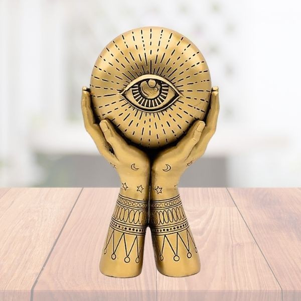 Laissez entrer la force du regard intérieur dans votre espace avec cette sculpture mains ouvertes portant en son centre un œil mystique “qui voit tout”. Façonnée dans un métal doré, ses dimensions compactes (12,5 × 7,5 × 2,2 cm) la rendent idéale comme élément décoratif spirituel discret mais puissant.