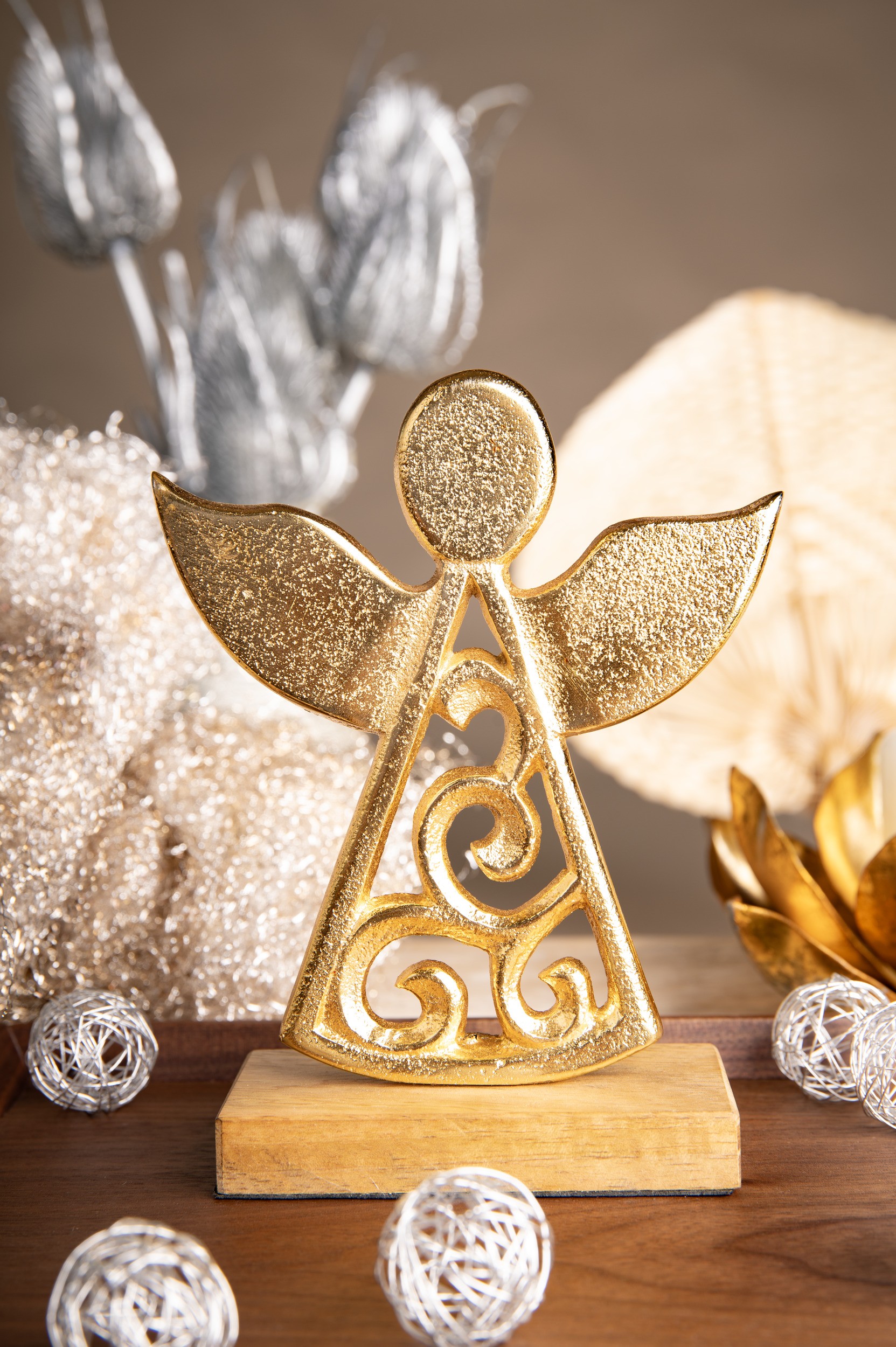 Détail : gravures fines, posture angélique, ailes, halo, attributs de lumière