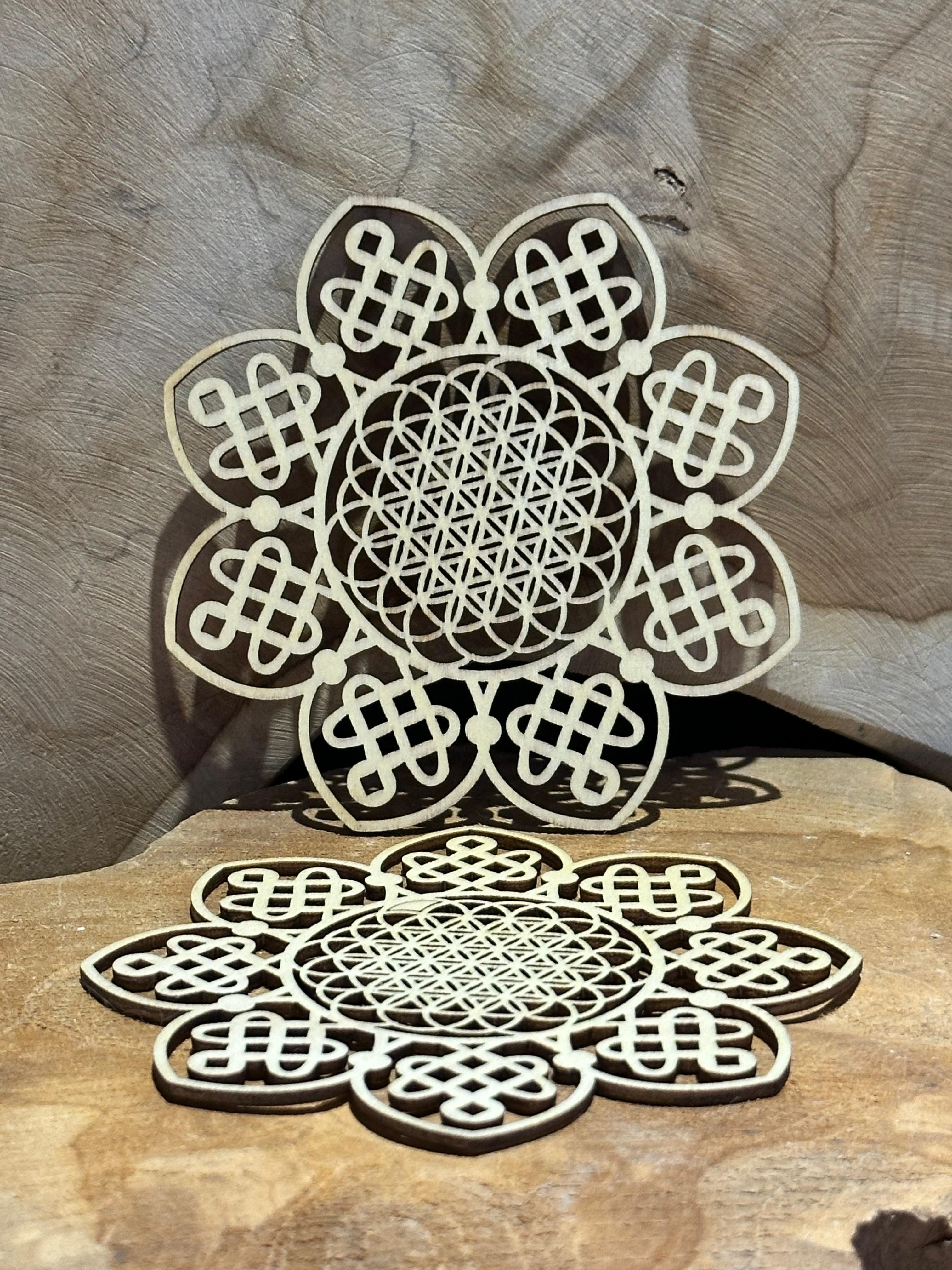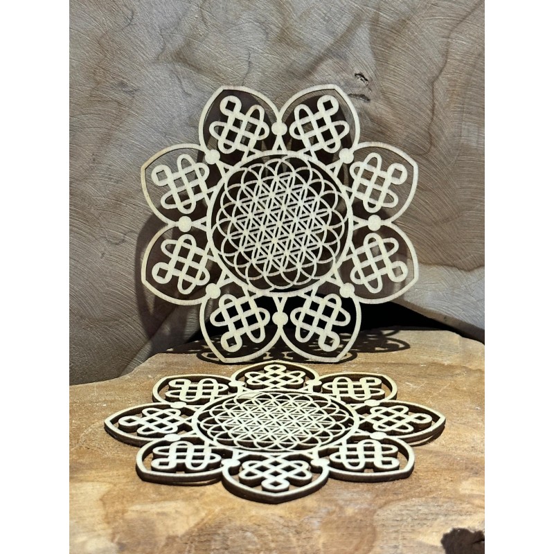 Sublimez votre espace avec ces magnifiques sous-verres Fleur de Vie Infini en bois naturel.